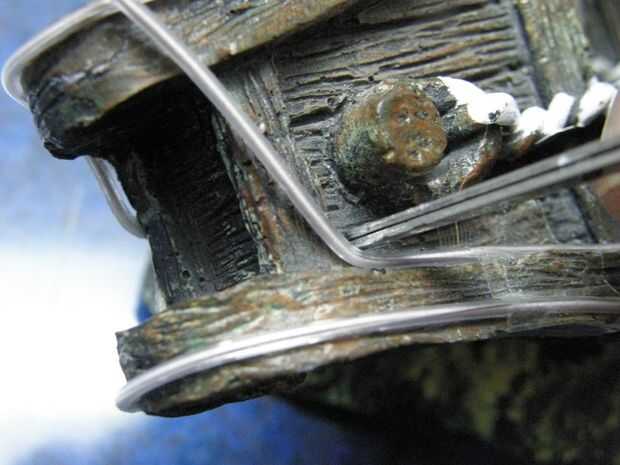 Parada el El cable al barco utilizando pequeños trozos de cinta adhesiva y aplique media gota de pegamento entre el alambre del y el barco. Presione con los dedos. Necesita unos minutos stick por lo que tenemos que tener paciencia.