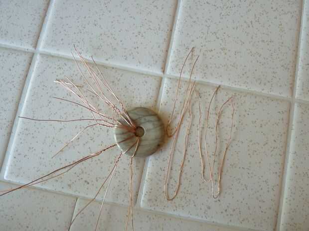 Enganche el alambre doblado en el donut. Entonces tuerza cada par de cables 15mm - 20mm desde el borde del donut. Usamos los alicates de punta plana.