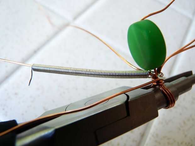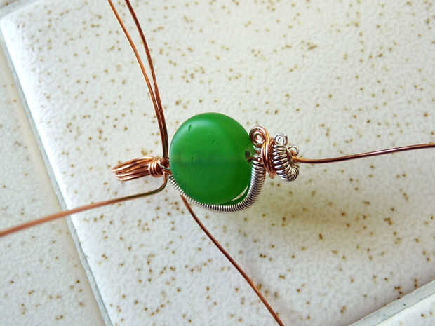 Un elemento común de este tipo de colgante es un alambre en espiral. Para ello, enrollar el cable de luz (calibre 24) alrededor de uno o más de las cadenas pesadas. Otro método es enrollar la bobina en un mandril, gran trabajo de pinchos, luego deslice la bobina de y sobre los cables colgantes.