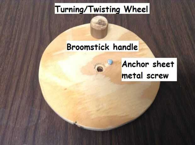 Uno de ellos es el mango de una escoba que se utiliza para hacer el giro. Cortar 1" pedazo de palo de escoba y atornillado y pegado a la rueda de giro. Yo también lijar los bordes para que sea menos probable cortar a alguien usarlo.