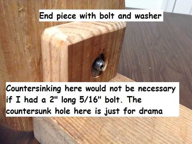 Un problema que tuve fue que no tenía tiempo suficiente 5/16" perno y tuvo que comprometer por hundir la tuerca y la arandela en la pieza final. Esto no sería necesario con un tornillo de 2" de largo. Sin embargo, un tornillo de 2" de largo requiere mucho más de la perforación del taladro de 1/8". Por lo tanto, tenga en cuenta también.