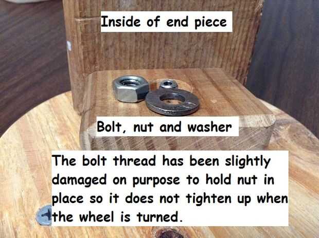 Yo deliberadamente dañado el hilo en el perno de 5/16" para evitar que la tuerca de ajuste cuando la rueda fue darse la vuelta. Realmente hice el daño sobre un hilo de rosca en, por lo que podría empezar la tuerca en el perno, lo contrario sería casi imposible poner la tuerca en el perno. Si tienes una largo 2" perno, puede utilizar dos tuercas y una arandela para hacer el mismo trabajo. Sólo Coloque la arandela de seguridad entre las dos tuercas y apriete hacia abajo duro.