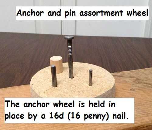 El centro de la rueda es el pin. En este caso, el pin es simplemente un corte de un clavo 16 penny. La idea es que este conjunto de la aguja tiene que ser bastante fuerte, porque el estrés de torsión del cable es considerable como consigue emparejado en giros más finos y más finos. No queremos cualquier pieza para ir volando a la habitación o en la persona que lo utiliza.