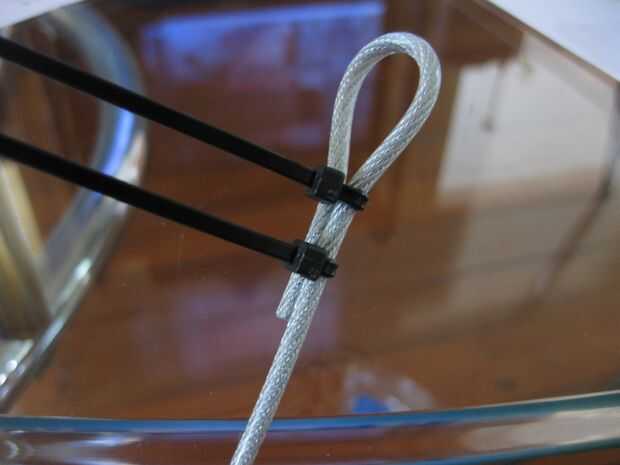 Deslice dos ataduras de cremallera en el un alambre y doblar un extremo del alambre para crear un bucle. Ahora fije las abrazaderas de plástico para sostener el lazo. Recorte el exceso de los lazos del cierre relámpago.