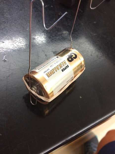Colocas los dos clips a la batería D Cell con el elástico para fijarlos en su lugar. Coloque la bobina en la parte superior los clips de papel de modo que se crea un circuito.