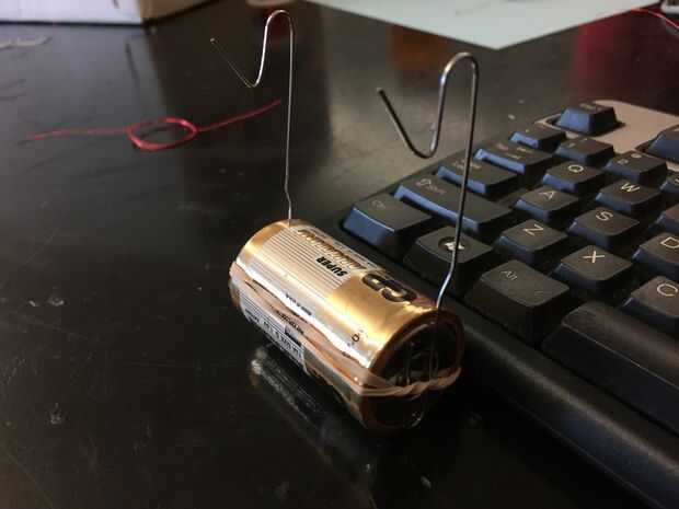 Reunir materiales:Papel de lijaBatería DBanda de goma2 clipsLongitud del brazo un cable rojo (calibre 26)ImanesPaso 1: Enrolle el cable en un círculo, dejando aproximadamente una pulgada de izquierda de alambre a cada lado.El círculo debe ser como si