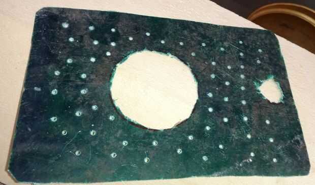 Luego hice los agujeros y cortes en la hoja de fibra de vidrio - usando una combinación de eléctrico taladro, Sierra eléctrica y el cuchillo para llegar a la forma como se muestra en la imagen. Me llevó unas cuantas iteraciones para obtener la forma correcta, por lo que la mecha (botella) calcen bien a través de, la pipa de agua que se ajuste correctamente y la hoja de sí mismo en la papelera de plástico como la capa media.