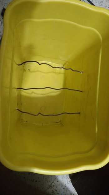 El centro de la capa (como llamarla), tiene la mecha y el suelo por encima de él. Quería que sea colocado sobre a medio camino a través de la papelera de plástico. Perforé 3 agujeros a lo largo de la longitud del recipiente plástico. Tomé el alambre de acero había enderezado antes y cortar 3 piezas y pasa a través de los agujeros en el recipiente. Los extremos de los cables estaban decididos, así que formaron un marco áspero de la capa media para sentarse (ver imagen)