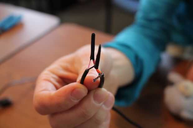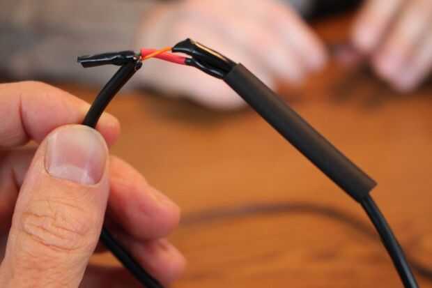 Cortadas dos tramos de calor tubo termoencogible para extender a ambos lados de la zona de cable que se unirá (probablemente unos 2" a 3") y deslice los dos tubos en la parte del cable en la preparación de la Unión. Ahora para las dos juntas! Gire los pares de hilos juntos asegurando que sólo los filamentos previstos del cable tocan (Recuerde sus opciones de color que no se mezclan); Tenga cuidado que no hay haya torones sueltos escapando de su paquete. Utilice cinta aislante para unir cada par, así como aislar las hebras se unió a unos de otros. Alinee cuidadosamente las juntas a lo largo del cable y luego deslice el calor colocado previamente tubo termoencogible para cubrir las dos áreas se unieron.