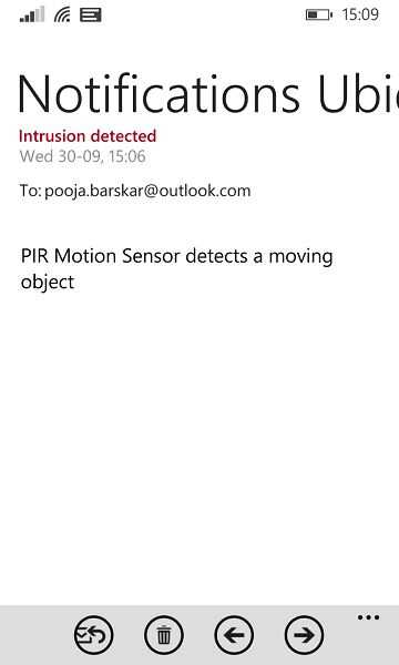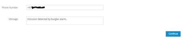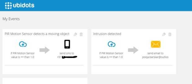 Ahora hemos añadido un Email y un SMS desencadena. Crear, cargar y ejecutar su código en Edison. Te darás cuenta datos enviar a Ubidots en la consola. Si cualquier movimiento es detectado por el sensor de movimiento PIR parpadeará el LED, tocar el timbre y un SMS y un E-mail será enviado a tu teléfono.