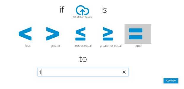 8) estamos enviando 1 si el sensor PIR detecta un movimiento, por lo tanto, para activar una acción nuestro valor debe ser igual a 1. Pulse continuar.