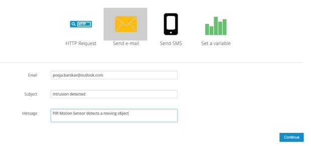 11) evento SMS se añadirán con PIR sensor valor igual a 1. Manera similar, que puede Agregar un desencadenador de correo electrónico.