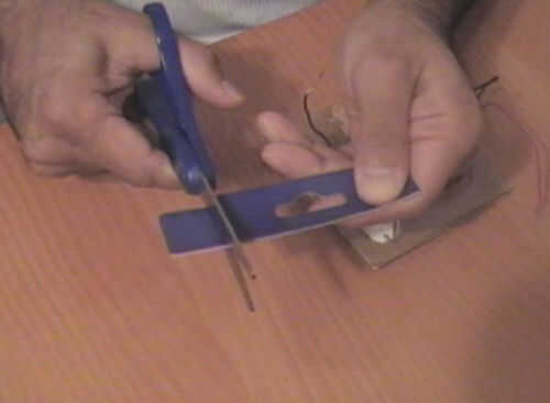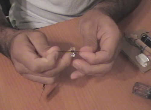 Corte un cuadrado pequeño de la pieza delgada de cartón (image1). Hágale un agujero en la plaza con su tachuela (image2). Tire de la cadena de hilo o la cometa a través del agujero y haga un nudo (image3). Ahora un nudo alrededor de la tachuela (image4).