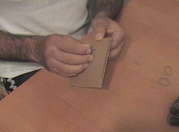Pase una banda de goma por el agujero inferior y tire de ella a través del otro orificio. Fije la banda de goma en el otro lado con un clip para papel. Hacer esto para ambos orificios.