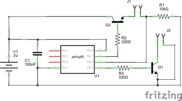 Q1 es un transistor de npn 2n2222 - Esto actúa como un interruptor para encender el circuito del transmisor de timbre Si ha surgido una trampa. Tenga en cuenta que el cable negativo del transmisor del timbre 12V está conectado a la tierra del circuito microcontrolador 3V. Pero no te preocupes, tu ATtiny85 no aparece ninguna de 12V.