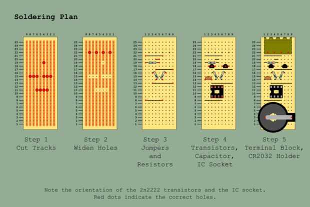 Podría diseñar un tablero de circuito impreso fantasia para este proyecto si lo desea, pero este simple circuito se adapta muy bien en una placa perforada de taladro estándar de 9 x 25. Si no has soldado nunca antes no te preocupes, hay un montón de excelentes tutoriales en la Web - prueba éste de Sparkfun.
