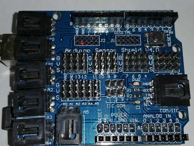 En primer lugar debemos preparar la placa Arduino. En nuestro que hemos montado un protector del Sensor Arduino que permite un fácil acceso a todos los pines en el Arduino a través de la sección de centro del tablero (juegos de 3 pines) y también proporciona V + y Gnd con cada perno de la señal que se puede utilizar según sea necesario.