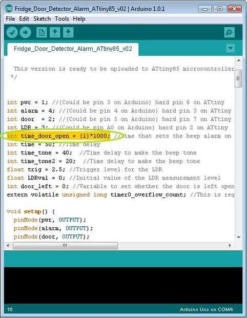 Se determina este tiempo después de abrir la puerta y hasta que oiga el pitido. Depende de la frecuencia de reloj cuántos segundos será el retraso. Escribí 1000, que en el Arduino Uno significaría 1000 milisegundos = 1 segundo. Pero sobre el ATtiny unos 9-10 segundos.