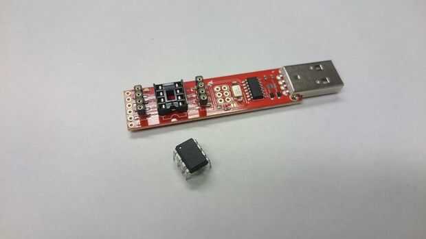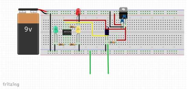 El pequeño programador es fácil de usar y primero me prototipo directamente en el tablero del programador, ya que cuenta con posibilidades para usar jumpeers a la protoboard. En la imagen adjunta sin embargo he puesto hasta el circuito completamente en el protoboard para más fácil comprensión (he subido una foto del circuito producido en Fritzing para ello).