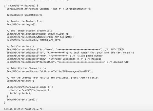Paso 4: Agregar sus credenciales de Twilio y Temboo el dibujo.