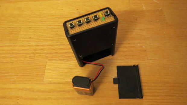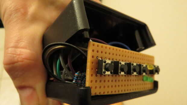Apriete los cables en la caja y cerrar el cuadro, colocar el timbre (que hasta ahora ha sido colgar suelto) en la parte superior la baratija Pro. Esto puede ser un poco de un desafío y probablemente requiere doblando los alambres una cantidad justa para encajar todo, especialmente los cables a los botones de los 5V del carril en el lado cercano de la Junta (en la foto 1).