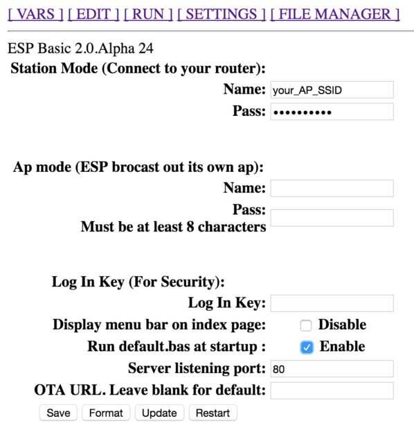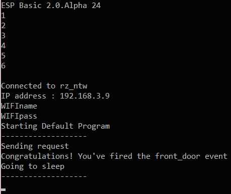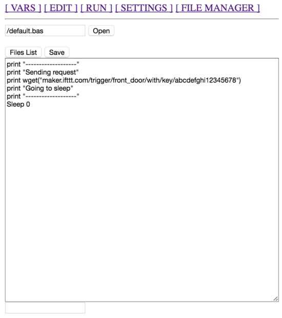 - Cuando el ESP8266 arranca, se conecta a la red wifi y funciona default.bas (este es el programa que acabo de escribir),