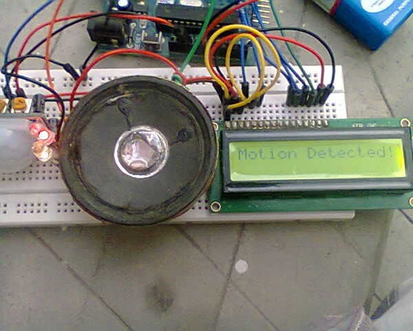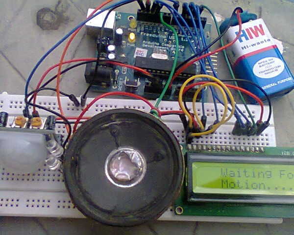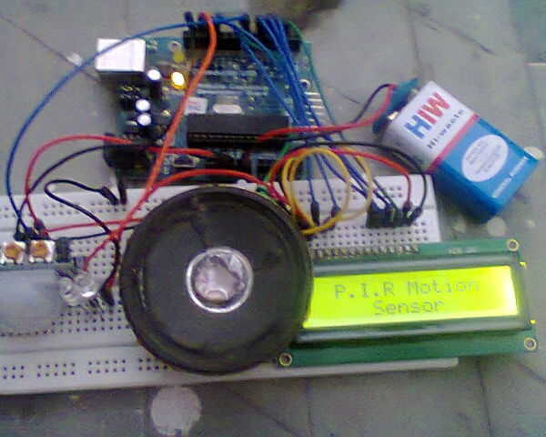 El cuerpo genera cierta energía térmica en forma de infrarrojos que es invisible a los ojos humanos. Pero puede ser detectado por el sensor electrónico. Este tipo de sensor se compone de material cristalino que se Pyroelectric.In este proyecto, estamos utilizando módulo de Sensor de movimiento del P.I.R. como un sensor de infrarrojos que genera carga eléctrica cuando se expone en calor y envía una señal al arduino. Según nivel de infrarrojo sensor, Arduino muestra el estado en LCD y comienzo, zumbido altavoces y brilla que el L.E.D.A sencillo programa se está ejecutando en arduino que comprueba el sensor si algo se mueve o se detectó un nuevo objeto.