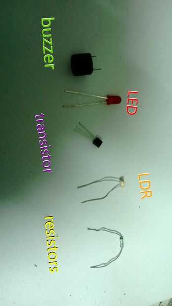 Esto es un diseño mío que se coloca dentro de una caja, cajón o nevera y un ruido de alarma cada vez que abres la caja, cajón o nevera. Se utiliza un resistor sensible a la luz y es tranquila cuando está oscuro (se cierra el cuadro) y reproduce un so