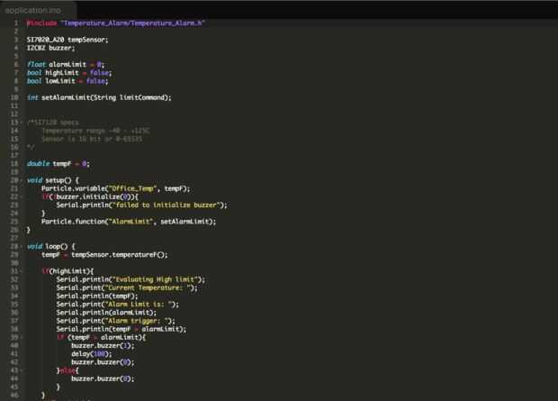 Haga clic en el icono de las bibliotecas de la izquierda, luego buscar bibliotecas comunitarias para alarma de temperatura. Asegúrese de que está seleccionada la pestaña de application.ino y luego en el uso de este botón de ejemplo.