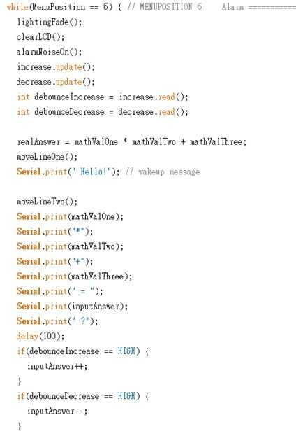 AlarmNoise en es una función de tono que coloca el timbre en un patrón familiar "alarma ". realAnswer almacena la respuesta real que se apagará la alarma. Las dos últimas funciones comprobar si los botones arriba / abajo que se haya pulsado, que a su vez cambia el valor de entrada.