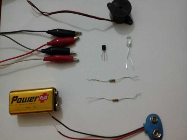 los materiales necesarios están Transistores bc 548 2 resistencias de 220 ohmios led rojo zumbador (opcional) batería 9v cables de tapa de la batería de 9V