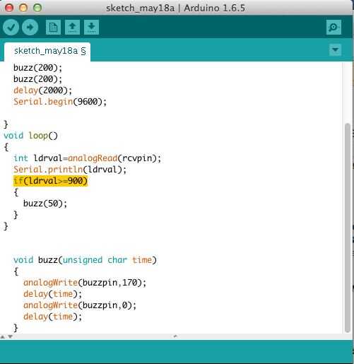 void setup() {pinMode(rcvpin,INPUT); pinMode(buzzpin,OUTPUT); buzz(200); buzz(200); buzz(200); delay(2000); Serial.Begin(9600); } void loop() {int ldrval=analogRead(rcvpin); Serial.println(ldrval); Si (ldrval > = 900) {buzz(50);}} void buzz (tiempo unsigned char) {analogWrite(buzzpin,170); delay(time); analogWrite(buzzpin,0); delay(time);}
