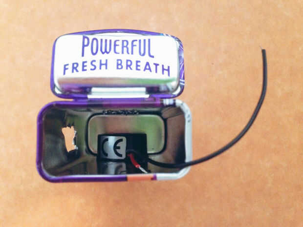 combinan una lata de la menta, sirena piezoeléctrica y algunos componentes básicos en una alarma personal que es funcional y visualmente agradable. Este diseño implica conectar 12 voltios Batería A23 a una sirena piezoeléctrica a través de un conmuta