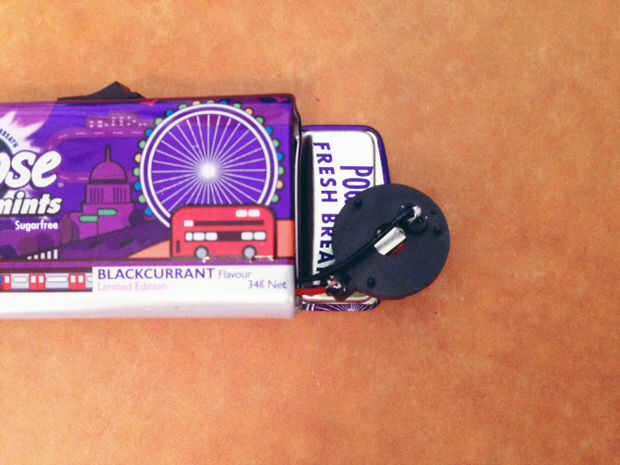 combinan una lata de la menta, sirena piezoeléctrica y algunos componentes básicos en una alarma personal que es funcional y visualmente agradable. Este diseño implica conectar 12 voltios Batería A23 a una sirena piezoeléctrica a través de un conmuta