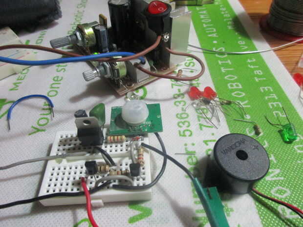 Se muestra el circuito totalmente configurado. Usé una fuente no regulada para alimentar el circuito. El voltaje real suministrado es alrededor 13.88V aunque dice 12V en la etiqueta de la fuente. Una vez conectado y el interruptor está conectado, el timbre sonaría en cada movimiento de un cuerpo relativamente caliente dentro de su gama.