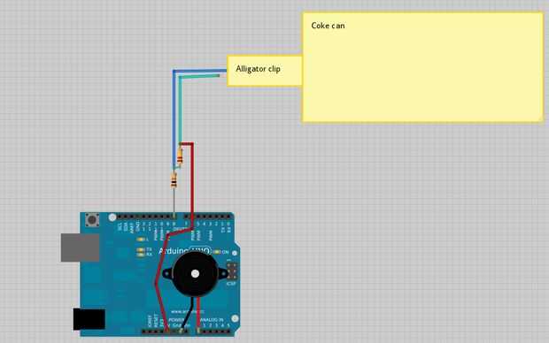 Lo que he visto aquí, el cuerpo humano está conectado a tierra, por lo que el aluminio de la lata y tus manos hacen una especie de condensador que tiene más capacidad como la mano está más cerca de la lata. Con Arduino podemos saber la hora de cargar el "condensador" y así la distancia entre la mano y la lata. Para hacer que, como se puede ver en la imagen, necesitamos una 270kOhm y un resistor de 10kOhm, un cable coaxial y una pinza de cocodrilo para conectar Arduino a la can y un altavoz piezoeléctrico para hacer sonidos cuando una parte del cuerpo humano es cerca de la lata. La fabricación de cable para conectar la lata con Arduino se explicará en el siguiente paso. Por ahora conectarse sólo el pin positivo (+) del altavoz A0 en Arduino un el negativo (-) a GND(Ground) (como se verá en próximos pasos, he añadido la goma elástica para fijación de altavoces a Arduino pero es principalmente inútil: es opcional)