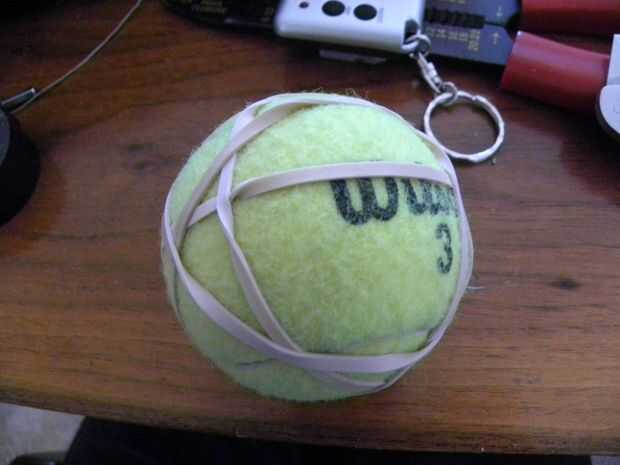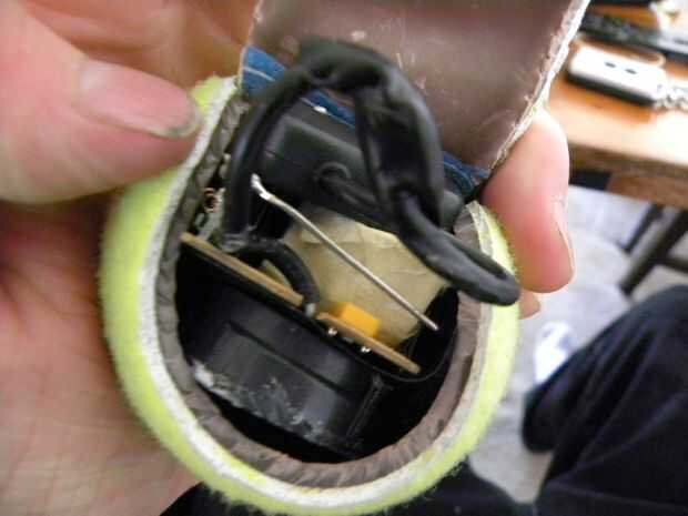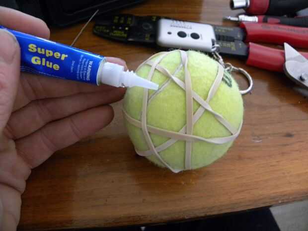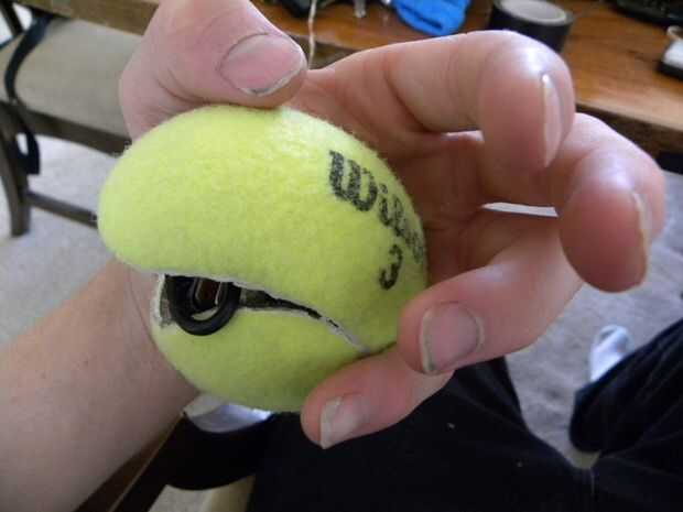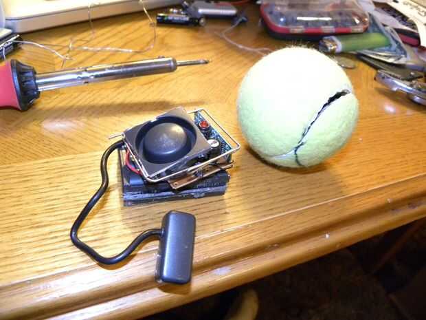Coloque la bola a través del corte hacia fuera a la electrónica. Luego pliegue la aleta de tenis hasta alcanza la forma original de la esfera. Coloque el interruptor de láminas magnético negro en posición que la flecha apunte hacia fuera hacia la pared exterior. Intente colocar el interruptor que una vez oculto estará ubicado directamente debajo de la etiqueta exterior. Esto ayuda a identificar donde el imán tiene que colocarse para armar el dispositivo.