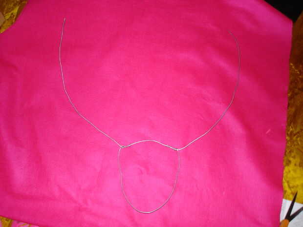 Con su cable, construya una estructura de alambre para tus alas como se muestra a continuación. Esto lo haremos utilizando dos diferentes piezas de alambre, uno para el pedazo grande de "u" en forma, alambre curvado hacia arriba en la parte superior y otra para el lazo que conecta a la pieza más grande y hace el "arnés" (que se utilizará para apoyar la espalda).