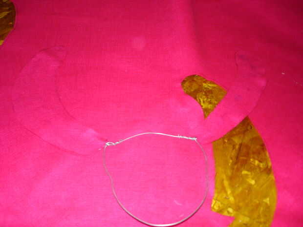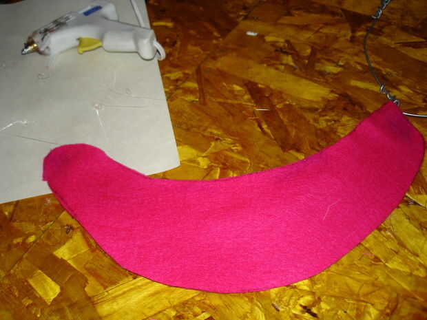 Cortar las formas con la tela doblada para que se queden con dos trozos de tela. Con el alambre que se intercala entre dos pedazos de tela, caliente pegamento las piezas de tela juntas, tal como se muestra a continuación para que el cable se cubierta en sentían excepto el aro de soporte. Hacer esto para el otro lado. Debe tener extraño sentía mirando en antler algo como se muestra a continuación.
