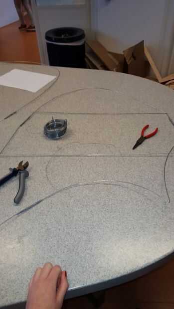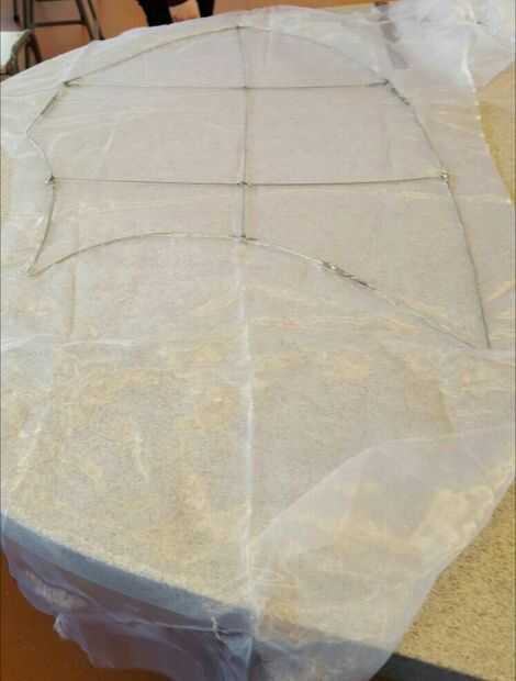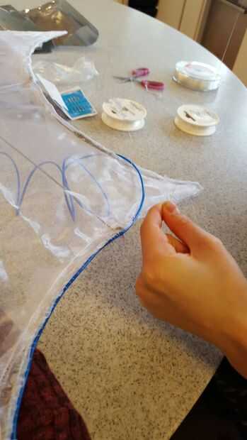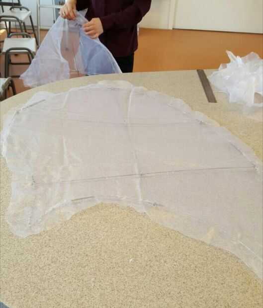 Después hemos hecho la forma de las alas, cubrimos las alas con un paño. La forma más fácil es coser con una máquina de coser. Y al final hemos cosido el alambre alrededor del ala. Wil se tiene que hacer este manual y con hilo de pesca.