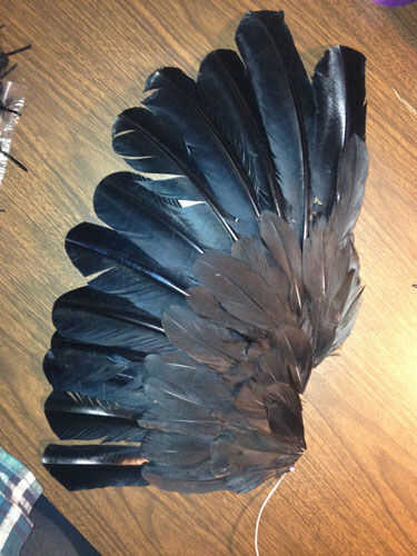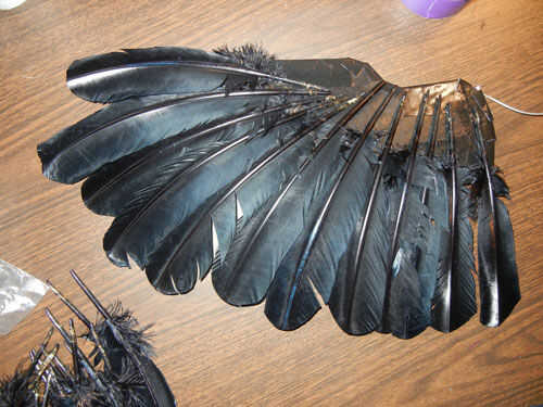 En lo que será la parte posterior o superior de las alas, comienzan a colocar plumas utilizando una pistola de pegamento caliente. He arreglado las plumas de pavo grandes como plumas primarias primero y luego había pegado en lugar. Si nos fijamos en la foto puedes ver que algunas de las plumas se superpone a la cartulina, pero sólo usted puede pegar la parte de la canilla de la pluma a la cartulina si quieres alas más grandes.