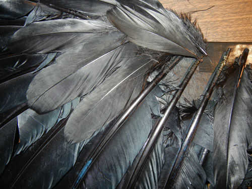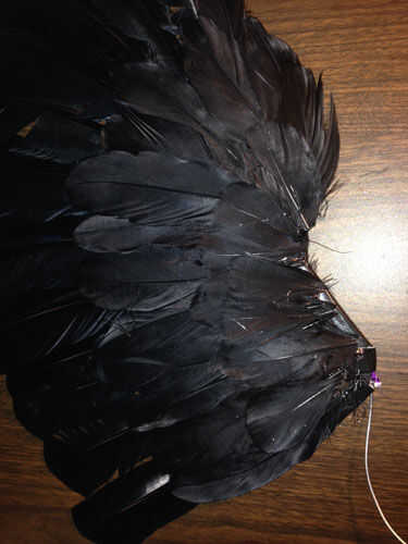 Una vez que las plumas primarias se pegan abajo, diseño el más pequeño ganso plumas para crear la siguiente fila de plumaje y ocultar las plumas primarias. Pegar estas en su lugar y repita hasta que la cobertura completa de la parte posterior del ala. Encontré que ya estaba trabajando hacia la parte superior del ala tendría que recortar las plumas de ganso pequeño y utilizar sólo las puntas redondeadas para cubrir totalmente las plumas de la fila anterior. Colocar las puntas redondeadas de las plumas en un ángulo también ayudó a crear un patrón más 'realista' de la pluma.