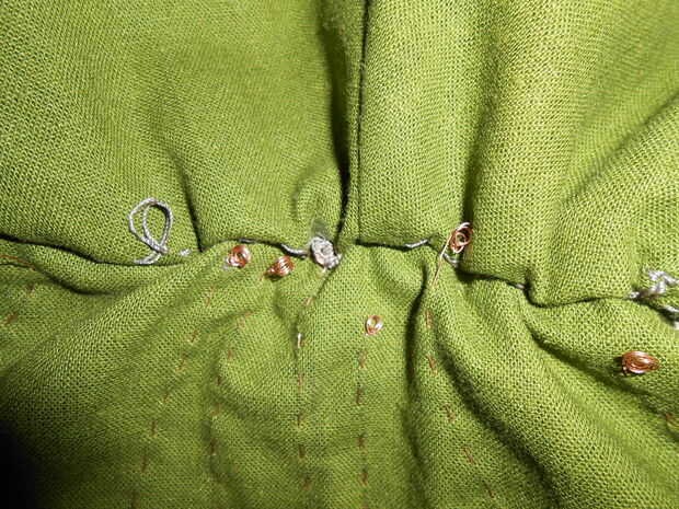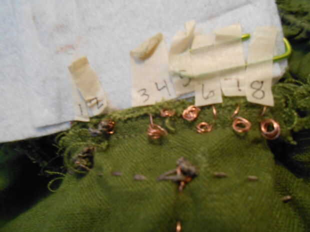 7. una vez que el pegamento está seco sobre los rectángulos de fieltro se adjuntarlo a la cintura del vestido en la espalda colocando el borde que tiene todos los bucles de alambre a lo largo de la costura de la cintura y coser en su lugar con hilo regular.