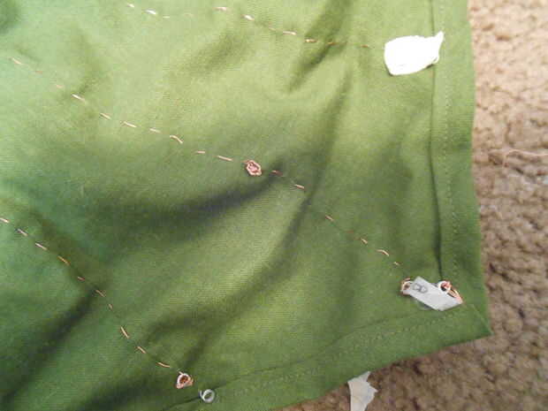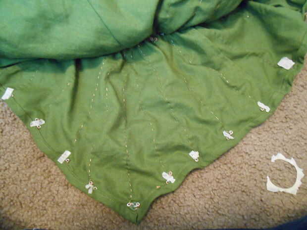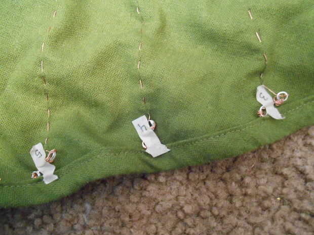 2. decida dónde desea las luces y ponerlos por meter las patas en el material y luego rizar los extremos en el otro lado. Meter la menor de las dos puntas hacia el dobladillo y las más largas hacia la cintura. (Algunos de mis luces fueron colocados a través de los agujeros que había cortado, pero he encontrado que esta forma era mucho más fácil y realmente se veía un poco mejor a hacerlo así). Mina coloca justo encima del dobladillo para que la línea negativa corriente sería más fácil a todas las luces pero usted puede colocarlos en cualquier lugar, sólo tienes que ajustar como se hace el cableado.