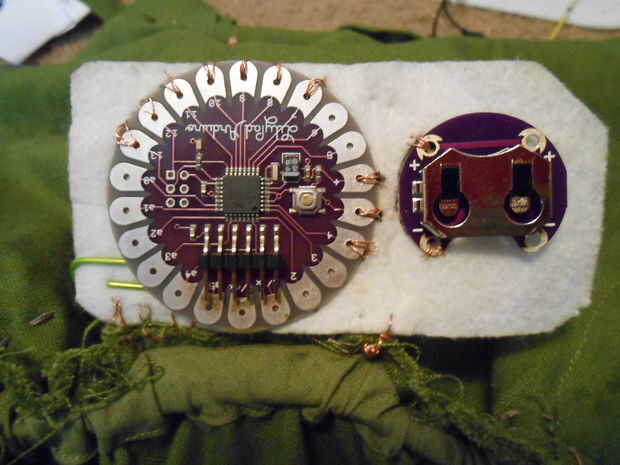 5. ahora corta un rectángulo de fieltro almidonada lo suficientemente grande como para caber su nenúfar y soporte de la batería. (Uno de los titulares de mi batería es en el reverso porque acabé añadiendo más tarde y no había planeado en él). Lugar el nenúfar sobre el rectángulo y uno a la vez Sujete el alambre de abalorios a cada puerto que desee utilizar entonces empujar por el fieltro y correr largo la espalda hacia un lado y hacer un bucle, igual que había hecho con las líneas positivas que cuelgue fuera del borde. Para ello el puerto negativo también.