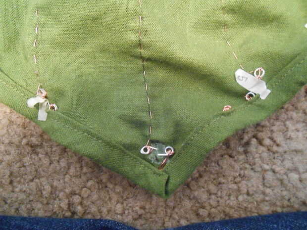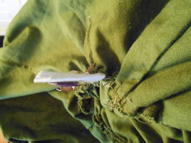 12. para hacer que el nenúfar y el soporte de la batería no son corte áspera y expuesto un rectángulo lo suficientemente grande para cubrir ambos lados de la almidonada fieltro uno de tela que coincide con vestido. Para darle fuerza, añadir algunas interfaces. Coser un borde de la tela a la parte trasera del rectángulo de fieltro a lo largo del borde que se une para vestir. Doblar para el otro lado y usando el Velcro fije para que el nenúfar está cubierto.