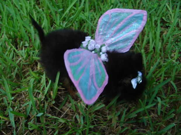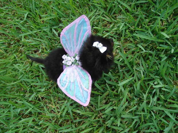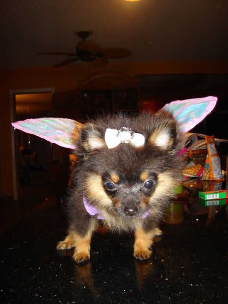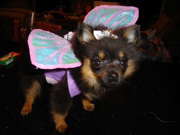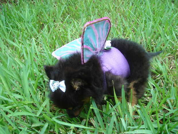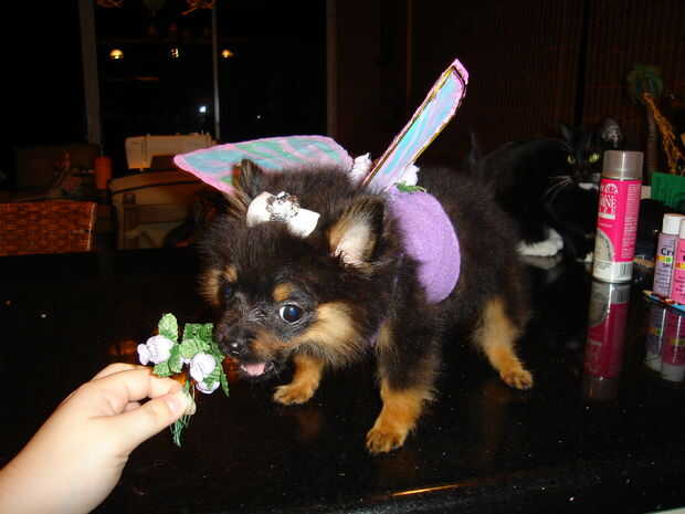 Estaba buscando un disfraz para mi libra 2 taza de té Pomerania Gigi, pero nada era lo suficientemente pequeño o bastante lindo. Ive sido hacer alas de hadas (para los seres humanos) durante un tiempo aunque y decidí ampliar mi diseño original, más simple hacia abajo un poco a le. Aquí está el resultado: