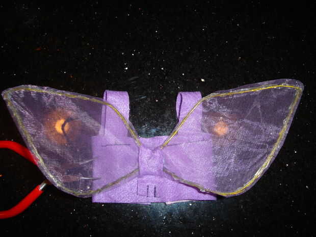 Usando pegamento caliente, pegar abajo de las alas al arnés. Usted necesitará usar mucho pegamento. Tengo una pistola de pegamento mini y usé unos 3 de los mini sticks para este paso.