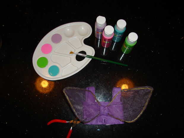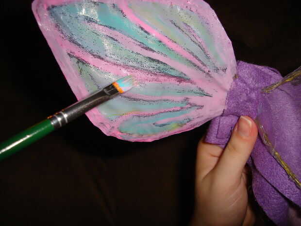 Me gusta usar pintura arte de acrílico encima con pintura de tela porque tiene colores vibrantes para elegir y usted puede siempre sellar posteriormente con sellador acrílico si crees que sea necesario. Si utiliza sellador, una vez que el sellador se rocía y húmedo, agregue el micro-brillo a las alas y lo ayudaremos a virar hacia abajo.