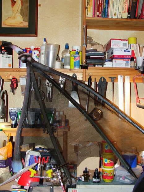 Empecé con una capa de color marrón oscuro (burnt umber) acrílico tinta de artistas. Una vez seco esto fue rociado sobre el larguero principal, nudillo articulaciones y cuernos con blanco opaco.